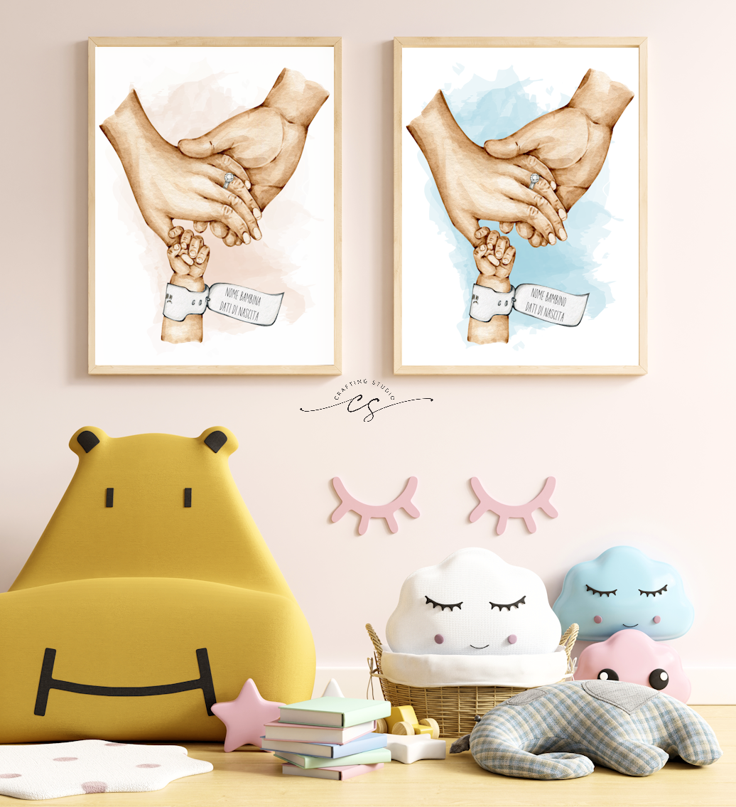 Elegante stampa effetto acquarello con nomi personalizzati, per imprimere il giorno del nascita. Aggiungi un tocco artistico alle tue pareti con questa stampa, perfetta per un regalo speciale ai nuovi genitori o per decorare la tua casa con un tocco di classe.